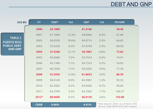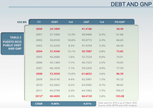 Puerto Rico’s public debt and GNP broken down for the last 12 years.